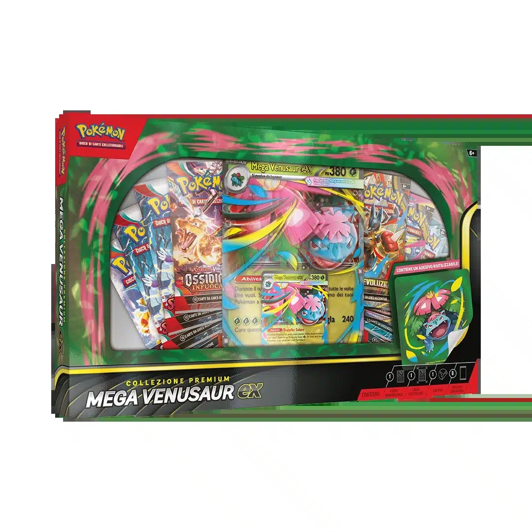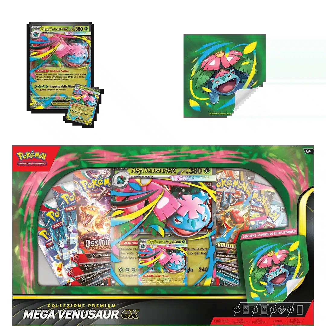 La collezione premium Mega Venusaur-ex del GCC Pokemon contiene:• Una carta promozionale olografica di Mega Venusaur-ex• Una carta promozionale lenticolare gigante di Mega Venusaur-ex• Un adesivo di Mega Venusaur• Otto buste di espansione del GCC Pokémon