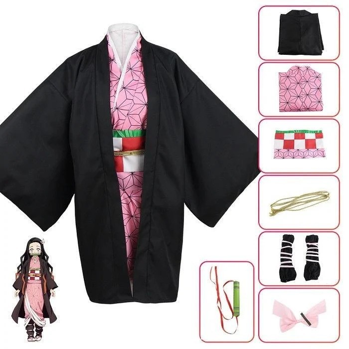 Costume cosplay ispirato a Nezuko Kamado di Demon Slayer, perfetto per fiere, feste a tema, Halloween o eventi cosplay.