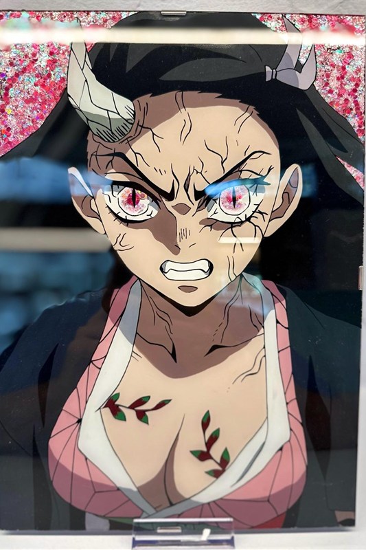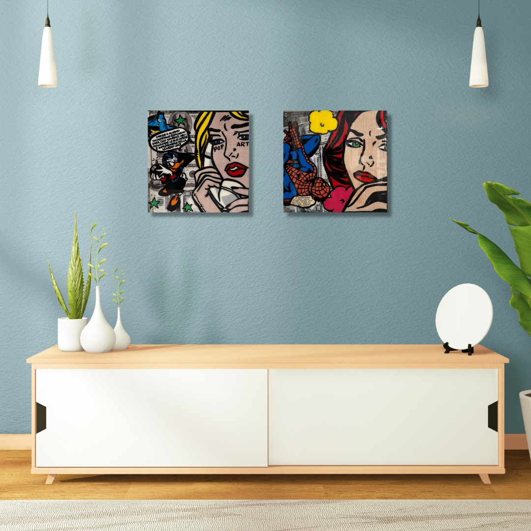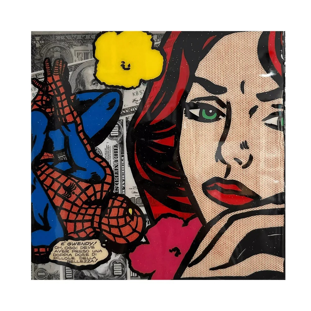 Quest'opera combina l'arte dei fumetti con la pittura tradizionale, creando un'esplosione di colori vibranti e dettagliati in una composizione unica. La resina conferisce una superficie lucida e protettiva, aggiungendo profondità visiva e preservando la vivacità dei colori.