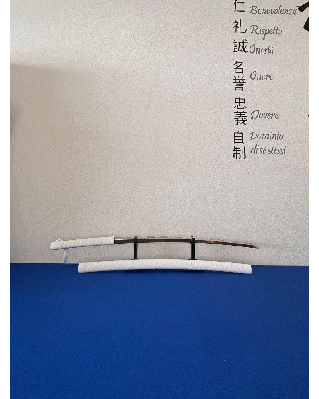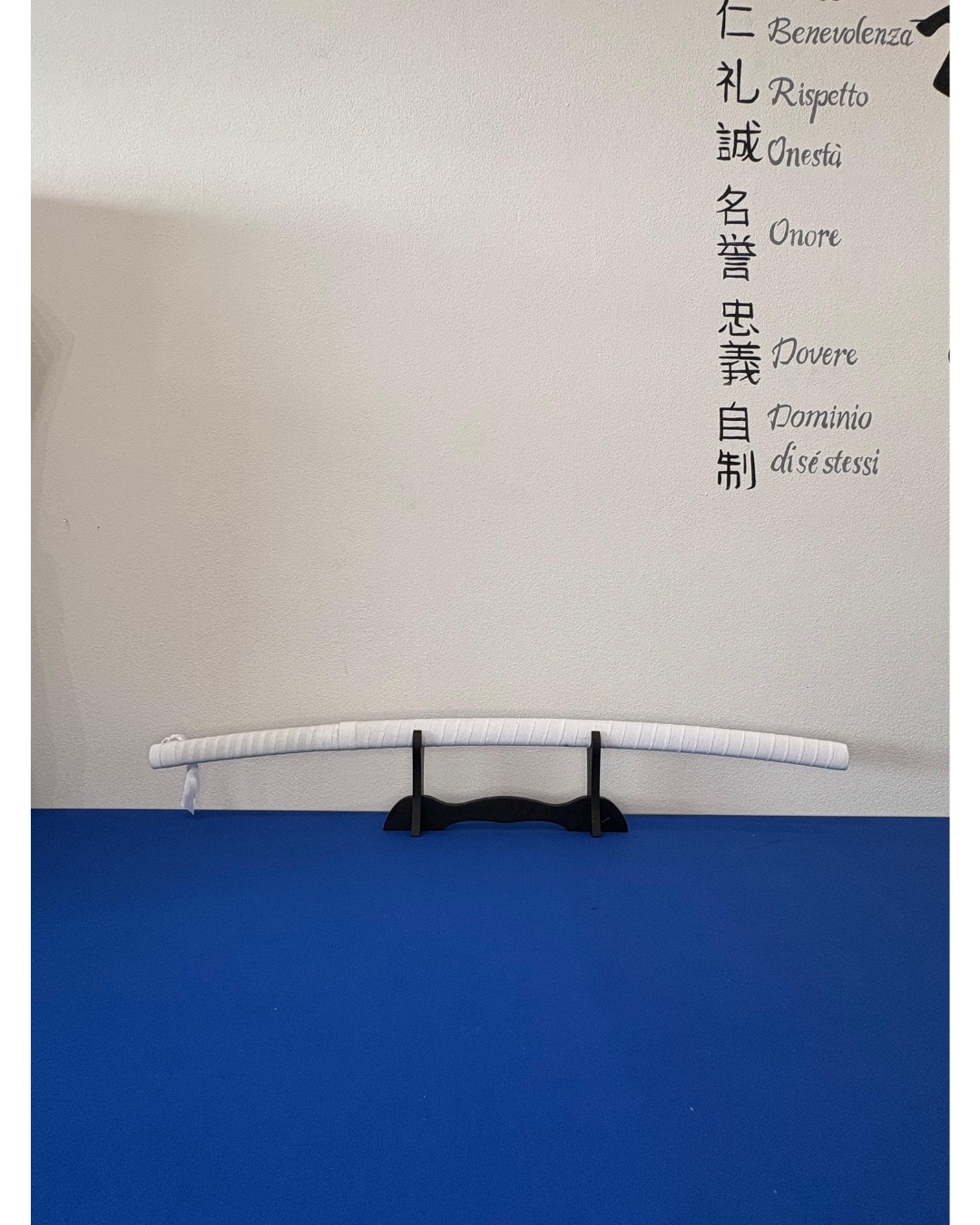 Katana con lama in acciaio. Fodero ed impugnatura in legno rivestiti di tessuto bianco.Ispirata a Demon slayer