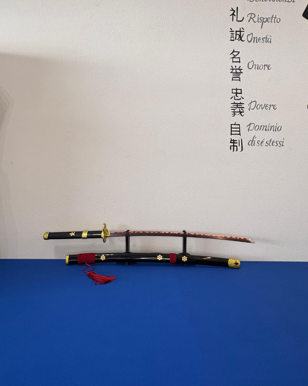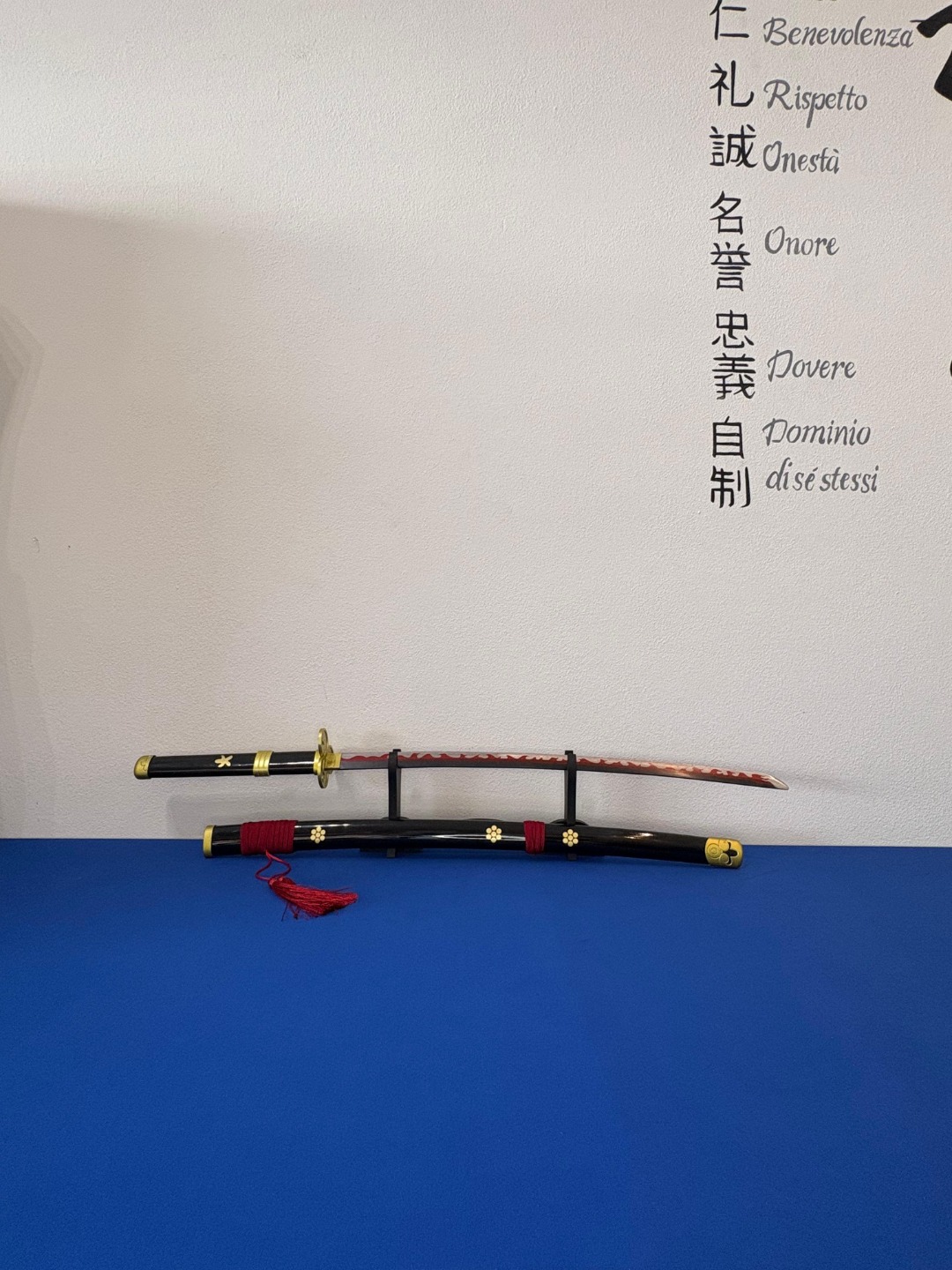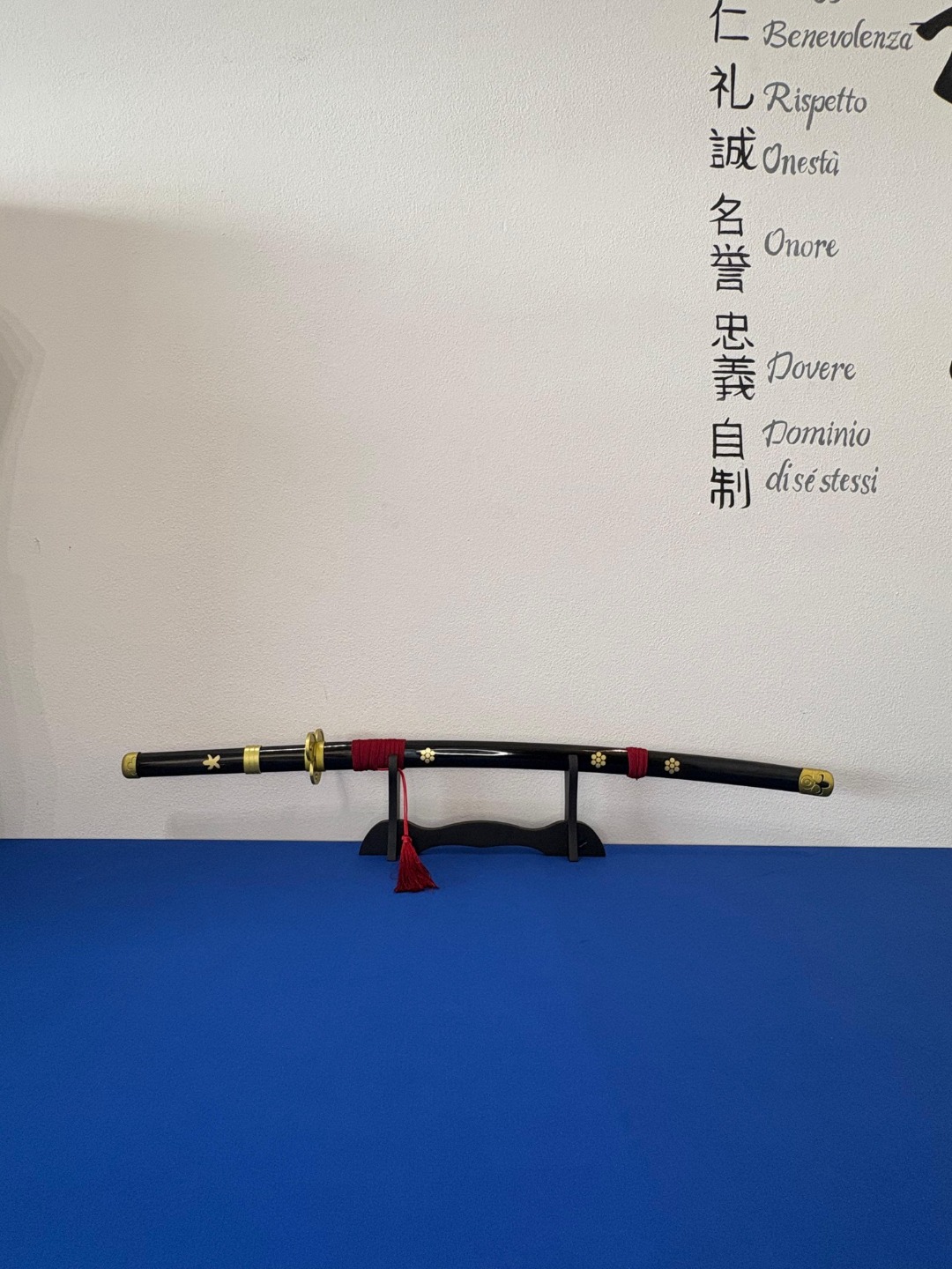 Katana fantasy con lama in acciaio, fodero nero ed inserti oro e rossi.