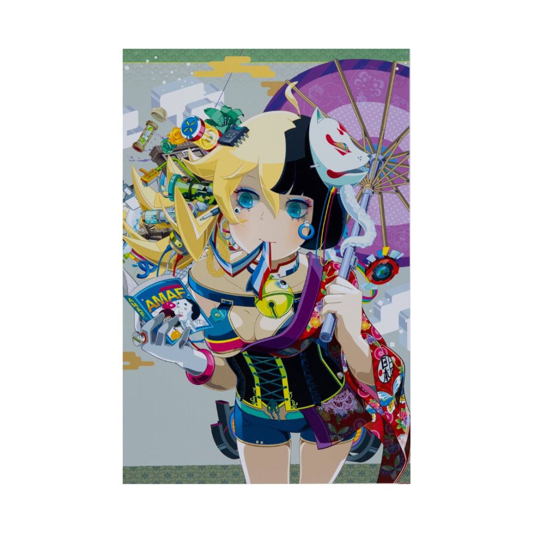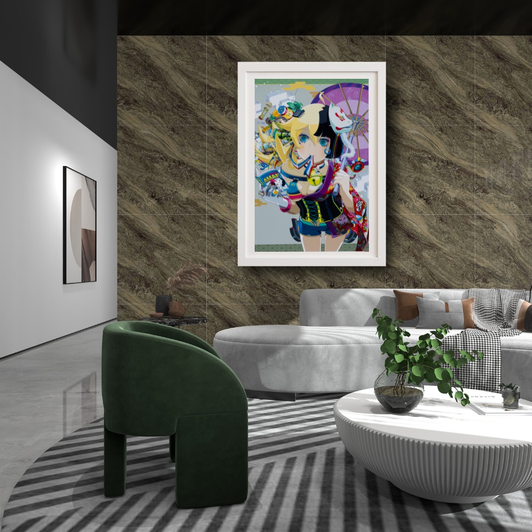 In questa composizione, l'artista raffigura una ragazza dall'estetica kawaii, vestita secondo le tendenze della moda street giapponese. Il suo stile combina abiti casual contemporanei con elementi tradizionali, come il kimono, l'ombrello e un giornale manga, creando un contrasto armonioso tra modernità e cultura classica.