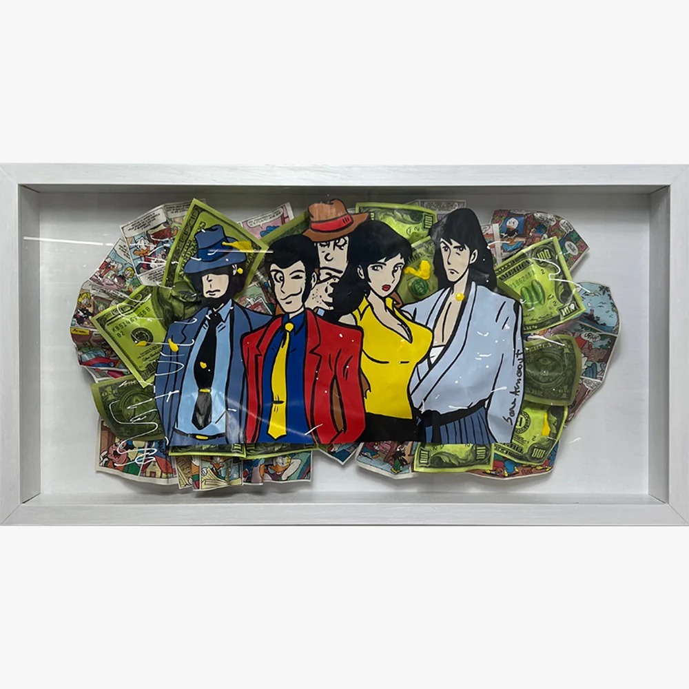 Tecnica: Ritagli di fumetti vintage e disegni dell'artista su carta poggiati su tela e racchiusi in una cornice a cassetta in legno e plexiglass.