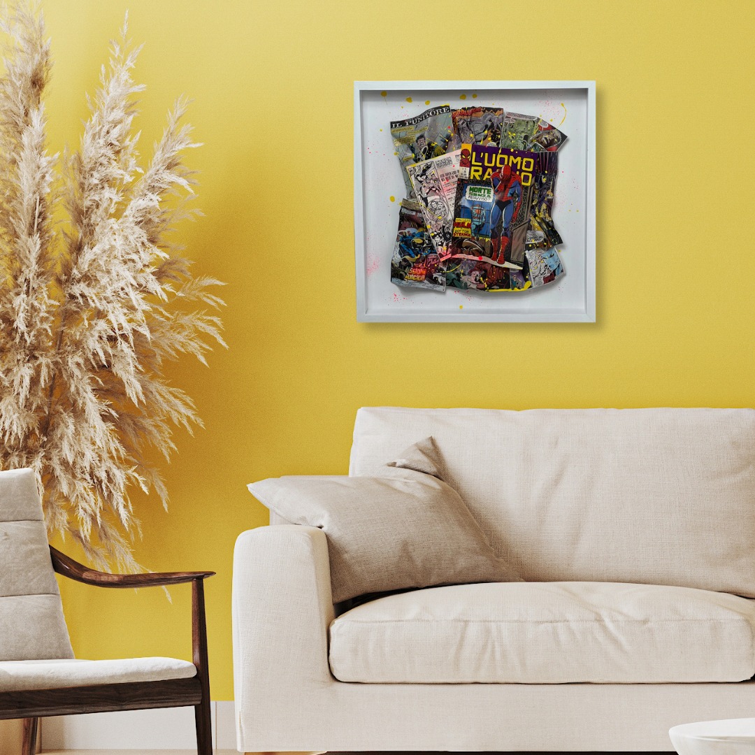 Tecnica: Ritagli di fumetti vintage e disegni dell'artista su carta poggiati su tela e racchiusi in una cornice a cassetta in legno e plexiglass.