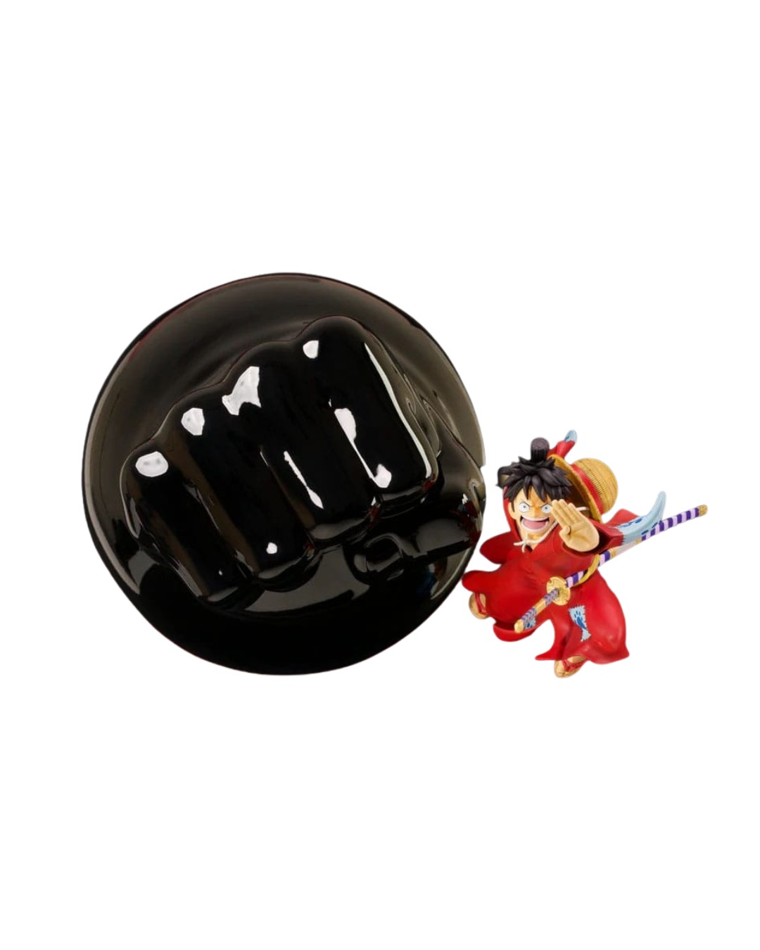 Nella prima battaglia di Rufy contro Kaido, lui si ubriaca e va su tutte le furie nel paese di Wano. Rufy è pieno di rabbia e passa all'offensiva e si lancia in aria e fa barcollare Kaido con la sua tecnica Gum-Gum Elephant Gun raffigurata in questa statua. Rufy è visto nel suo kimono Wano, la sua mano sinistra protesa in avanti per bilanciare e mirare mentre il suo braccio destro è armato all'indietro e potenziato pronto per la distruzione assoluta.