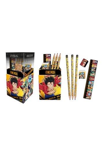 Set cancelleria a tema One Piece contente: - 3 x matite - 1 x gomma - 1 x righello - 1 x temperamatite - 1 x portamatite