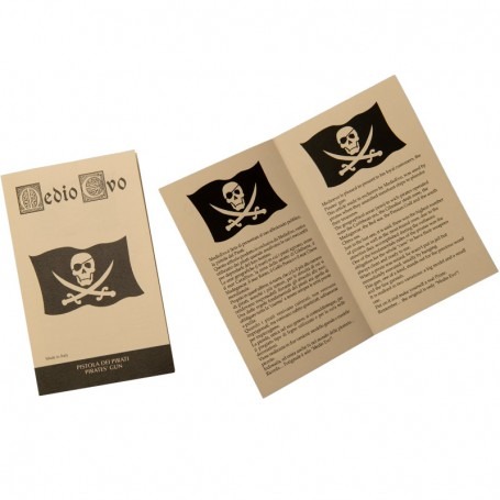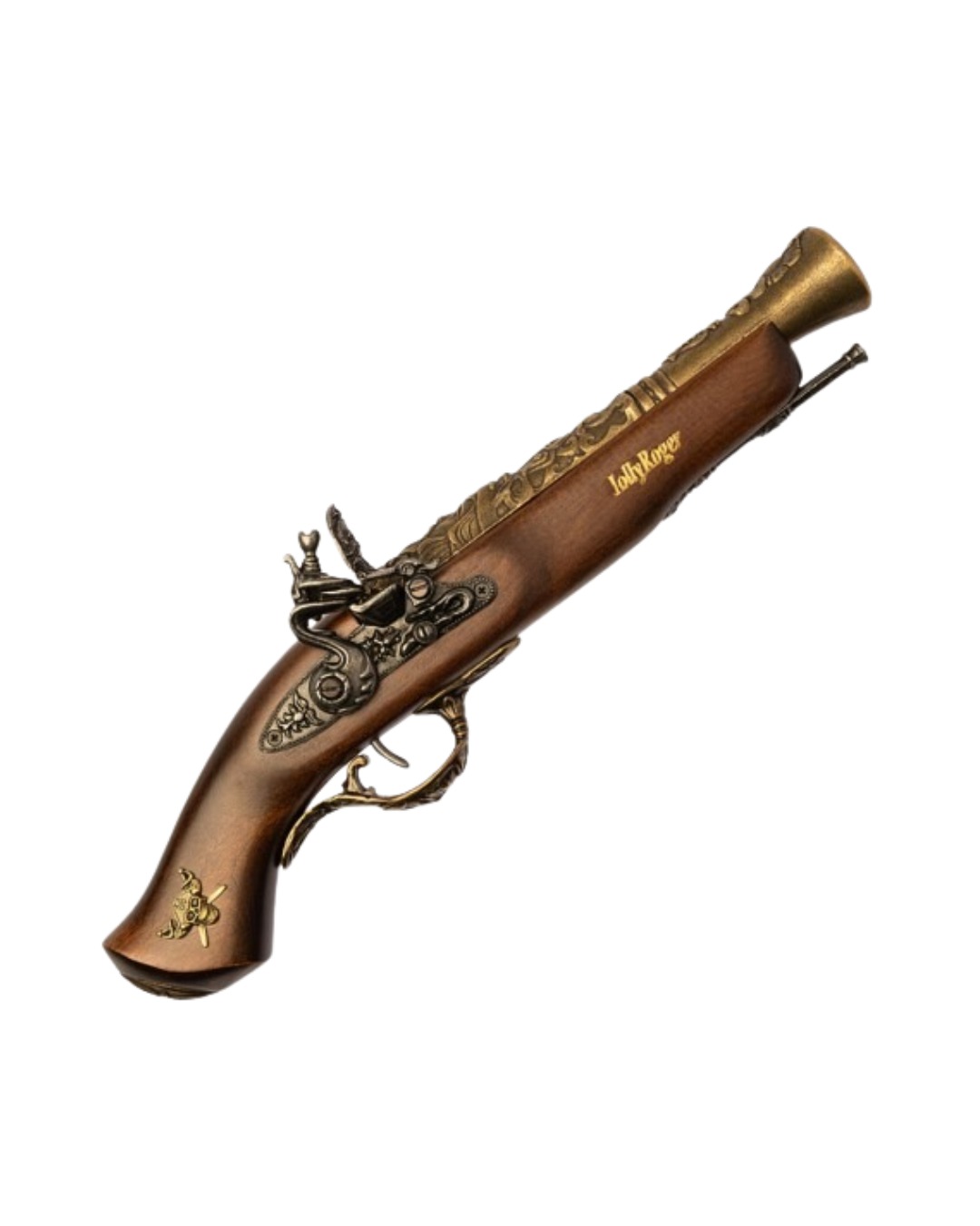 Riproduzione pistola dei Pirati realizzata interamente in legno con fornimenti in metallo fuso dorato. Viene fornita con scatola e garanzia che attesta la qualità del prodotto. Riproduzione non funzionante.
