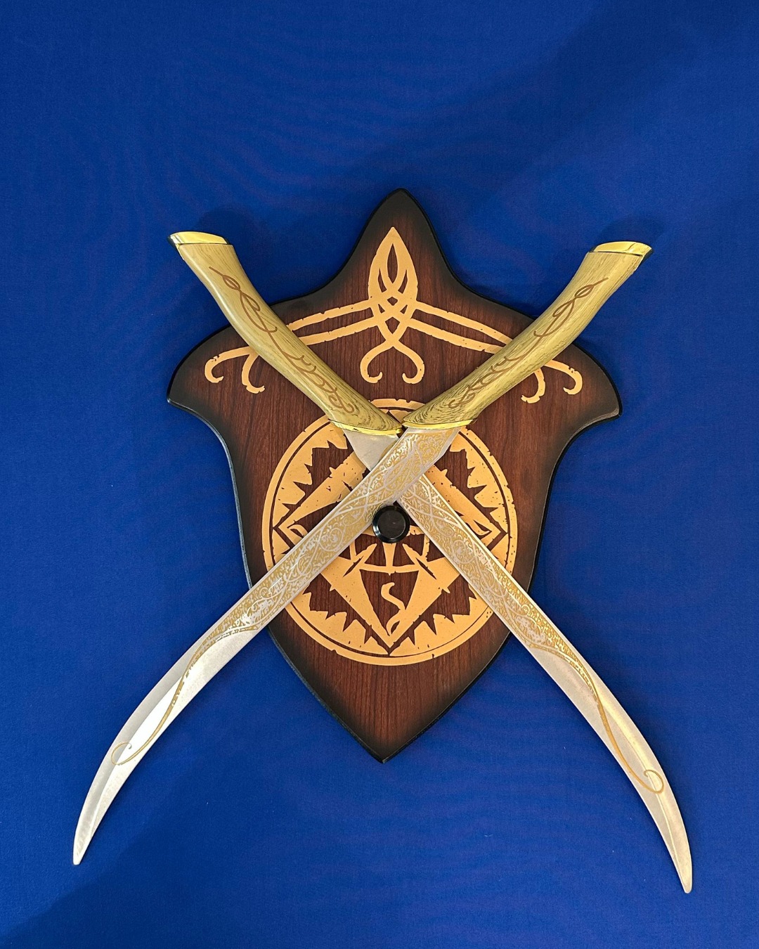 Pugnali ispirati a "Il signore degli Anelli" con lame in acciaio e supporto da muro incluso.