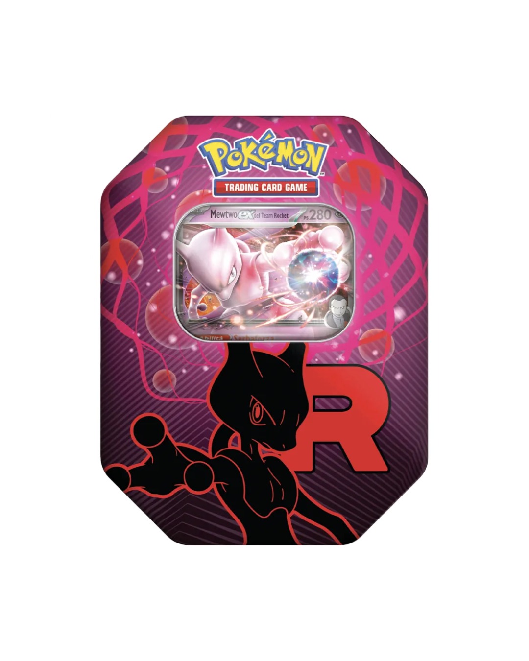 Questa Tin da collezione del team rocket contiene: una carta promozionale olografica di mewtwo-ex del team rocket, quattro buste di espansione del gcc pokémon una carta codice per il gcc pokémon.